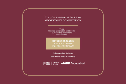 - Oct 24, 2025: Claude Pepper Elder Law Moot Court Competition at College of Law – Advocacy Center (LAC)FSU’s Claude Pepper Elder Law Clinic is proud to present the Elder Law Moot Court Competition! The event will draw teams from across the country to compete in Tallahassee, FL at the FSU College of Law on October 24-25, 2025. Schedule The 2025 competition will be held live, in Tallahassee, on Friday, October 24, and Saturday, October 25, with an awards dinner and ceremony to follow. The rounds will be held in the Advocacy Center, which was previously home to Florida’s First District Court of Appeal. The final round will even be live-streamed. AARP Foundation This year, we're thrilled to team up with the incredible AARP Foundation! AARP Foundation, a charitable affiliate of AARP, creates and advances effective solutions to reduce poverty for and with older adults. AARP Foundation advocates for systemic change in federal and state courts nationwide to advance the legal rights and interests of people 50 and older, particularly vulnerable individuals and those living with low income. We are so excited to work with this wonderful organization to raise awareness about issues affecting older adults and career opportunities for future lawyers focused on social justice advocacy. Thanks to the AARP Foundation, prize money will be awarded to the top teams and participants in the competition. Topic Our topic this year will address financial exploitation and liability issues surrounding retirement communities. Timeline of Events for the 2025 Competition Preliminary Rounds of Competition: October 24 Final Rounds of Competition & Dinner: October 25 Contact For questions, contact Rima Nathan at rnathan@law.fsu.edu. View on site | Email this event