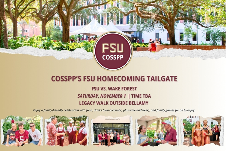 - Nov 1, 2025: COSSPP Homecoming 2025 Tailgate at Bellamy Building (BEL)TIMES TBD ACCORDING TO FOOTBALL SCHEDULE The College of Social Sciences and Public Policy (COSSPP) is hosting one more tailgate on Saturday, November 1 to kick off the Fall semester! For these events, enjoy a family-friendly celebration with food, drinks (non-alcoholic, plus wine and beer), and family games for all to enjoy. Be sure to check back here for updates as tailgate times are dependent on the FSU football schedule. FSU vs. Wake Forest Saturday, November 1 | Time TBA | Legacy Walk outside the Bellamy Building Join us for Homecoming on Legacy Walk outside the Bellamy building. Everyone is welcome with no RSVP necessary, just come on out and enjoy the day with us! View on site | Email this event