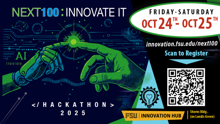 - Oct 24, 2025: NextEra Energy 24hr Hackathon - NEXT100: Innovate It at Shores Building (LSB)The NextEra of Emergency Response: A Hackathon to Transform how NextEra Energy Prepares for any Challenge Are you ready to transform the future of home energy? This 24-hour event invites you to team up with NextEra Energy, the parent company of Florida Power & Light, to develop innovative ideas that enhance energy usage and efficiency within the home. Bring your creativity and your ideas! Together, we’ll explore how cutting-edge technologies can improve the customer experience, making homes smarter, safer, and more energy efficient. Our Hackathon brings together students from all majors, with differing skills, creating teams of five, and challenges them to solve a problem using Design Thinking. Solutions can take any form including apps, physical inventions, services, systems, or a combination of the above. This exciting event gives you a chance to dive into NextEra Energy’s innovative culture and reimagine the future of energy in the home with technology, engineering, and communication. No programming skills required! Link for more information and to Register: https://www.innovation.fsu.edu/next100 View on site | Email this event