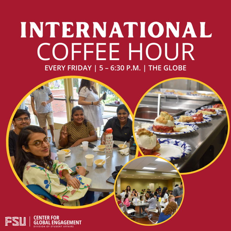- Oct 24, 2025: International Coffee Hour at Global and Multicultural Engagement Building (GME)Join the Center for Global Engagement every Friday when classes are in session from 5 to 6:30 p.m. at The Globe for refreshments from a featured country and interaction with students, scholars and faculty from around the world. This event is open to all current FSU students, faculty and staff. View on site | Email this event