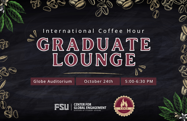 - Oct 24, 2025: International Coffee Hour: Graduate Lounge at Global and Multicultural Engagement Building (GME)Join the Center for Global Engagement (CGE) and the Congress of Graduate Students (COGS) for refreshments, jazz and socialization with your peers at the second International Coffee Hour: Graduate Lounge! This event is open to all FSU graduate students, faculty and staff and will feature the International Coffee Hour snack of the week, additional hors d'oeuvres and refreshments, and live jazz performances. The International Coffee Hour: Graduate Lounge will take place on Friday, October 24th, from 5-6:30pm in the Globe Auditorium. Mark your calendars for Spring Grad Lounges on January 23rd and March 6th! View on site | Email this event