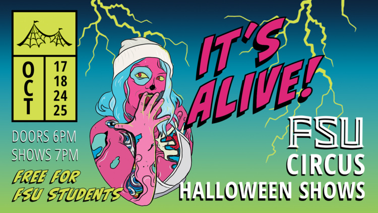 Oct 24, 2025: FSU Flying High Circus - Halloween Show Series at Jack Haskin Circus Complex (CIR)The FSU Flying High Circus is back with the 15th Annual Halloween Show Series, their first shows under the brand-new Big Top! Entry is free for FSU students. Performance Schedule: Friday, Oct. 17 Saturday, Oct. 18 Friday, Oct. 24 Saturday, Oct. 25 Doors: 6pm / Show: 7pm Entry is free for FSU students! On the day of show, simply present your FSU ID at the door! Visit http://circus.fsu.edu for details. View on site | Email this event